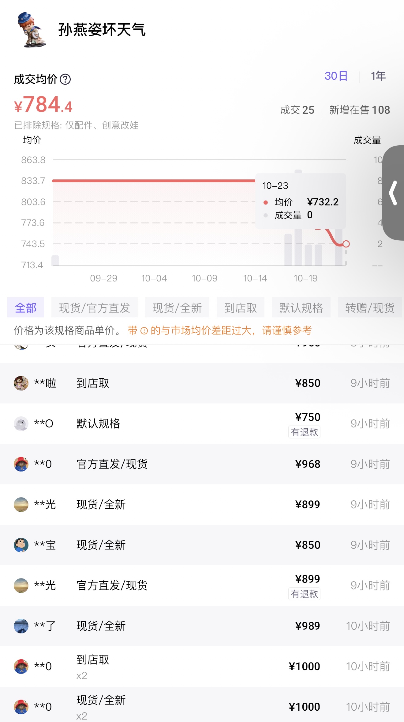 此次新品发售,两大热款在潮流交易平台,均有不同程度的溢价,以孙燕姿联名款手办“坏天气”,是泡泡玛特继周深联名后的第二个明星项目。联名以Hirono小野IP为核心,主题源自孙燕姿歌曲《坏天气》,通过雨天背景和歌词元素传递情感共鸣。该款定价699元,发售当晚立刻秒空。在千岛app上,记者注意到驰盈策略该款在售108个,价格在700-1000元之间,最高价格出现在得物app,售价1099元,溢价超1.5倍。