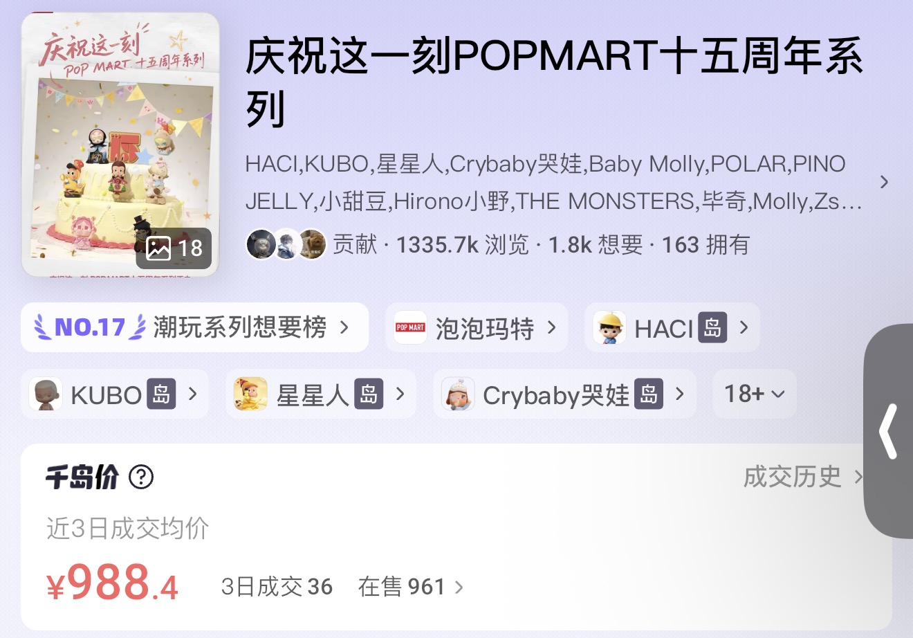 值得注意的是,当晚发售的“庆祝这一刻”POPMART十五周年系列手办是泡泡玛特为品牌15周年推出的代表作,该系列涵盖了LABUBU、星星人、CRYBABY、MOLLY、DIMOO等IP全明星阵容,合计15个常规款和1个隐藏款,一端盒价格在1035元,在潮流交易平台售出800元至1020元,已经低于原价。