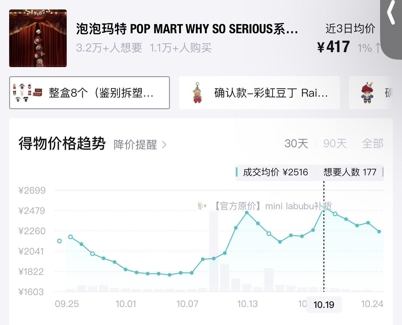 从近期市场热度看,该系列手办热度不及同为全明星阵容的万圣节“WHY SO SERIOUS”系列,该系列端盒原价1272元,最高成交均价2516元,其中,隐藏款“月影假面”成交价由159元涨至1999元,溢价11.6倍。
